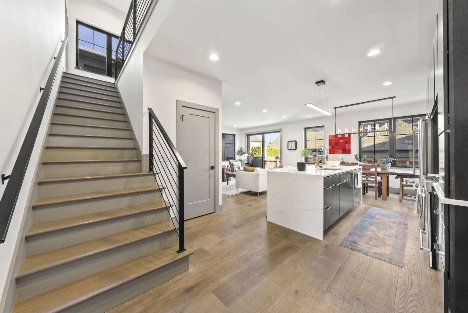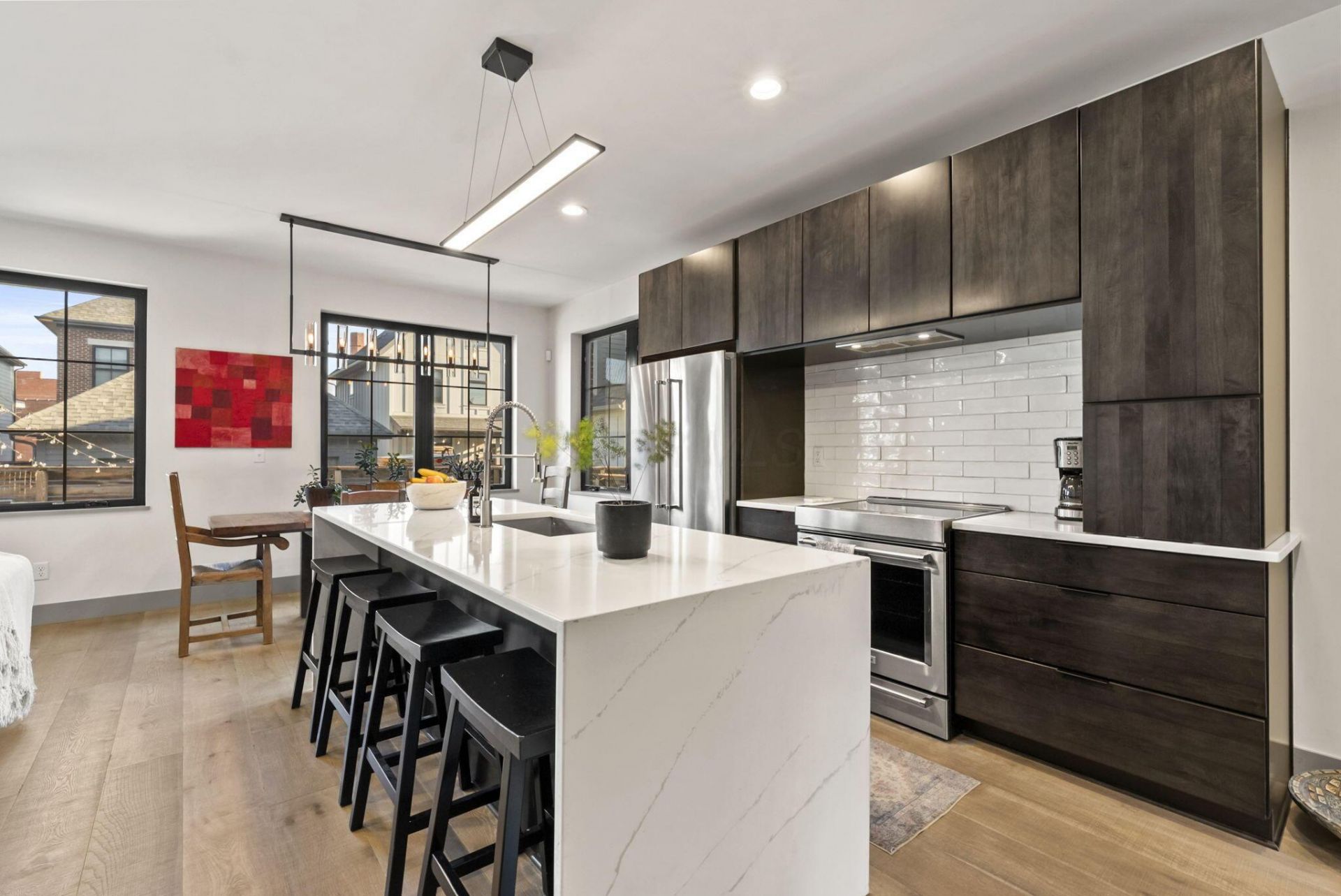 Pull up to a home that turns heads, then step inside and feel the city fall away.Light pours through oversized warehouse-style windows, washing across wide plank hardwood floors and climbing up to soaring ceilings. Over 3,000 square feet unfold in front of you, open and impeccably designed, every angle considered, every finish intentional.Drift toward the kitchen, where the home truly comes alive. Dark cabinetry meets gleaming white quartz. A waterfall island anchors the room, generous enough for four to gather around with morning coffee or late-night wine. High-end stainless appliances stand ready. Designer lighting glows overhead. It's a kitchen built for hosting, for cooking, for living.The dining and living areas spill outward from there in one continuous, light-filled flow. Friends move easily from counter to couch. Conversation drifts. The space simply works, whether you're hosting twenty or curling up with a book for one.Upstairs, the primary suite is its own kind of escape. Vaulted ceilings stretch overhead. A custom walk-in closet handles the wardrobe. The spa-inspired ensuite invites you to slow down, exhale, and stay a while. Three additional bedrooms and beautifully appointed baths offer room for family, guests, a home office, or whatever life calls for next.Practical details matter too. A spacious 2-car attached garage. And a rare 15-year, 100% tax abatement on the structure, a benefit that pays you back year after year.Then there's the location. Step outside, and the Short North and Italian Village are yours. Galleries, chef-driven restaurants, boutique shops, and Columbus' best nightlife are all just blocks away. Few neighborhoods offer this kind of energy. Even fewer offer it paired with a home this beautiful.